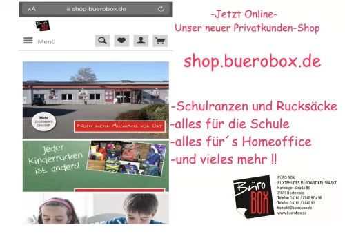 Ab sofort ist unser neuer Privatkunden-Shop online. Shoppen Sie ganz bequem rund um die Uhr! Lasst Euch von Neuheiten inspirieren, entdeckt Altbewährtes für das Homeoffice, die Schule oder den Alltag! Natürlich liefern wir die Ware auf Wunsch auch aus! Schaut vorbei unter shop.buerobox.de!!!!! Wir freuen uns auf Euren Besuch!!!